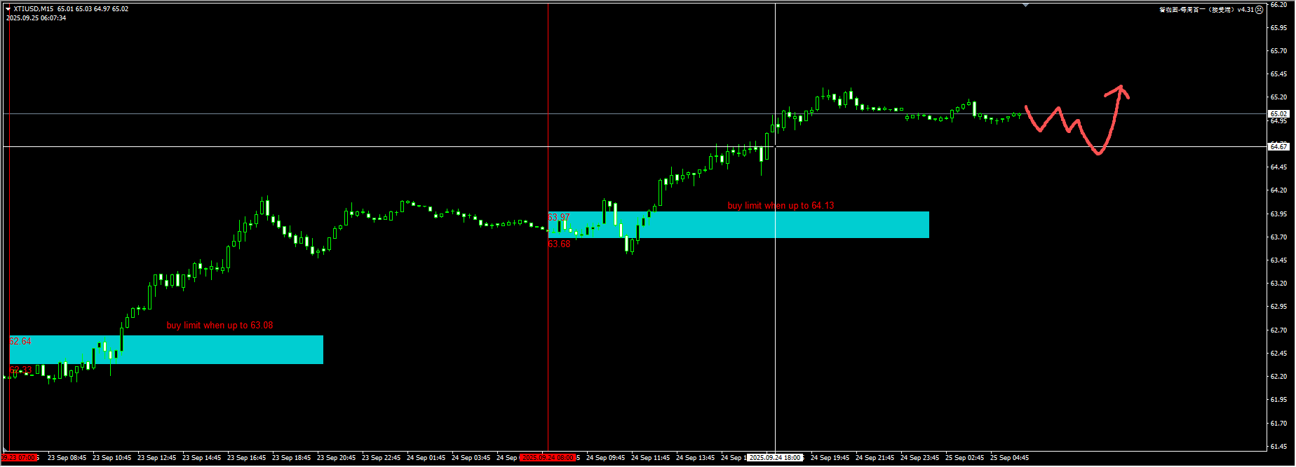 Crude oil: Yesterday, the price broke through the blue zone and also rose above 64.13, but there was no pullback. Therefore, the orders placed in the blue zone did not get executed. Today, we will continue to observe whether the price can stabilize and rebound again when it pulls back to around 64.50. For detailed positions, please consult the plugin.