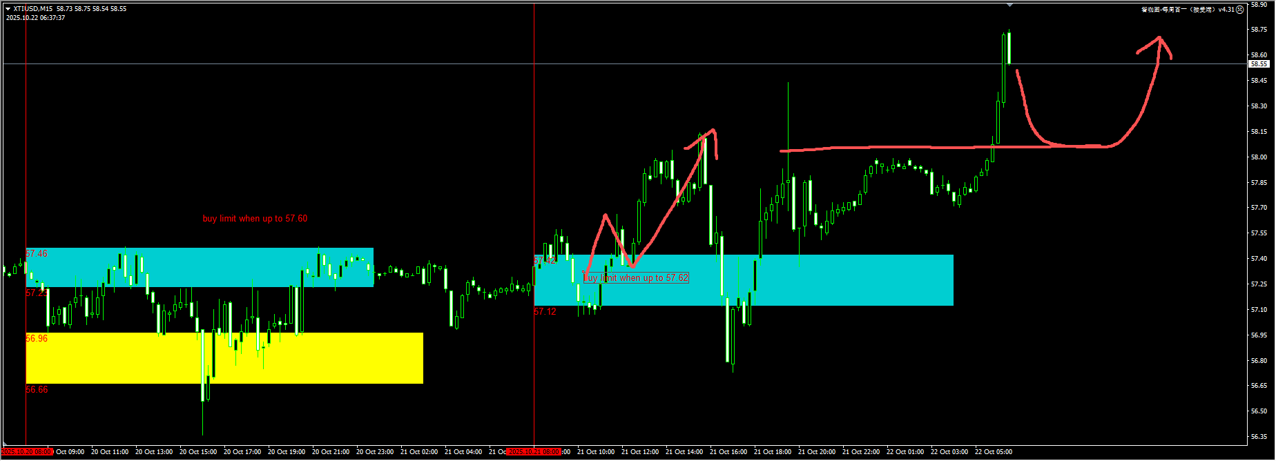 Crude oil: The operation in the blue area we alerted yesterday through the plugin could achieve a 2:1 profit-to-loss ratio. After the liquidity sweep, the price further rose above 58.50. Today, pay attention to the confirmation signal of the price retracing to around 58. For detailed positions, please consult the plugin.