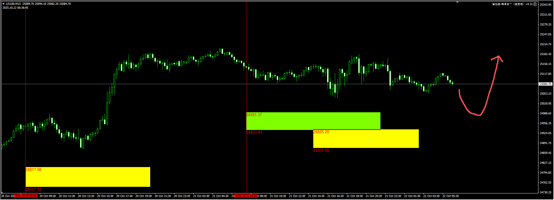 Nasdaq: Our position set up near 25,000 yesterday did not trigger. Today, we can continue to maintain the green + yellow strategy combination around this level. For detailed positions, please consult the plugin.