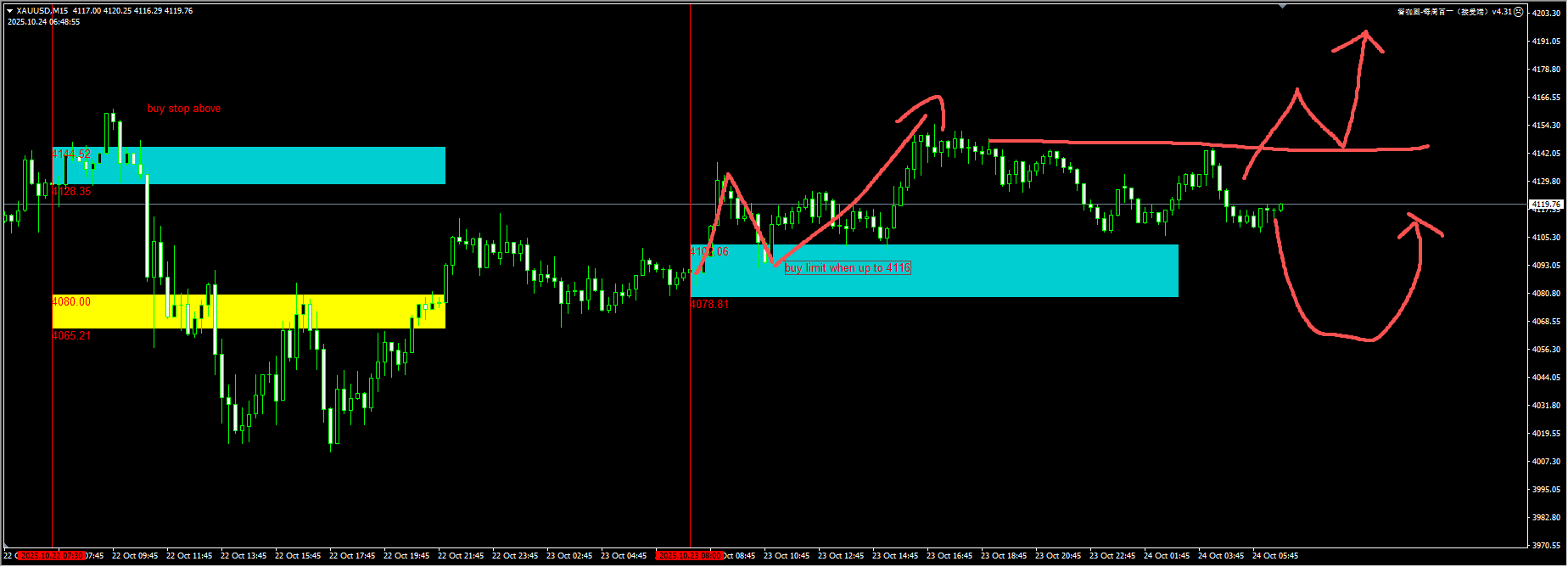 Gold: Yesterday, our plugin reminded us to place a buy limit order only after the price broke above the blue zone at 4116. The price movement yesterday was exactly as we expected, achieving a profit-to-loss ratio of more than 2 times. Currently, the price has not yet recovered to the key potential neckline level. A confirmed buy entry after a pullback is still needed for the momentum break. For detailed positions, please consult the plugin.