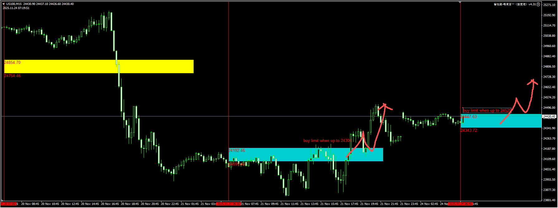 Nasdaq: Our strategy of buying after the pullback following the breakout to 24,300 in the blue zone last Friday was very successful, yielding a profit-to-loss ratio of over 3 times. We will continue to follow the breakout and pullback strategy intraday. For detailed positions, please consult the plugin.