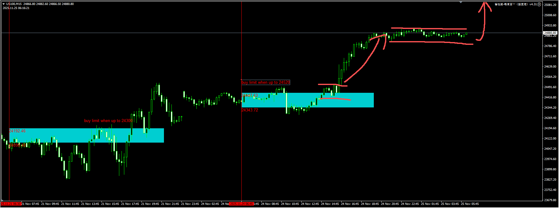 Nasdaq: After the blue area we alerted through the plugin was broken through yesterday, the expected pullback did not occur. The reason is that a new demand area has formed around 24,500. Due to the narrow range of price movement within the day, we will first observe the performance of the momentum break. For detailed positions, please consult the plugin.