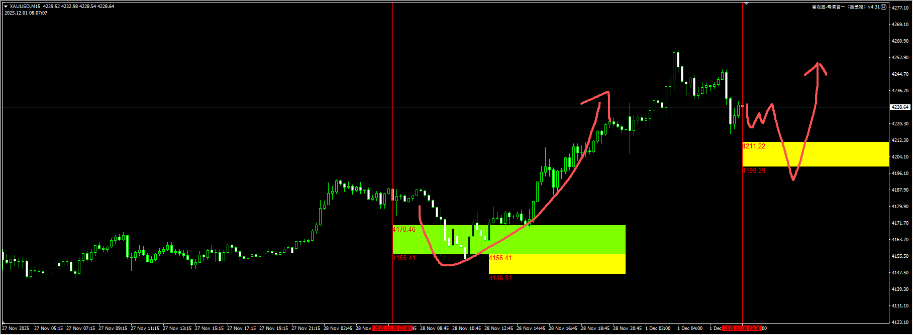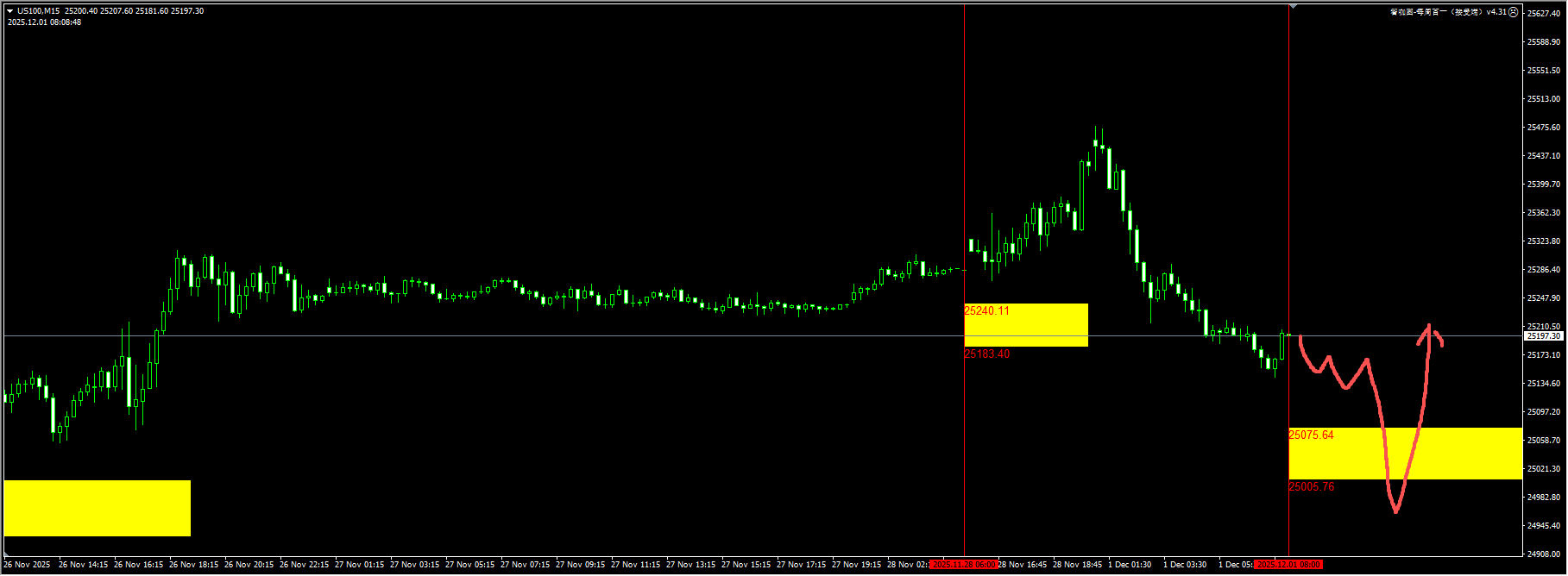 The Nasdaq: Last Friday, on-site liquidity was low, and prices have been falling continuously since the Asian market on Monday. It may test the 25,000 level. We suggest observing the rebound signal after the liquidity sweep and making 1-2 attempts. For detailed positions, please consult the plugin.