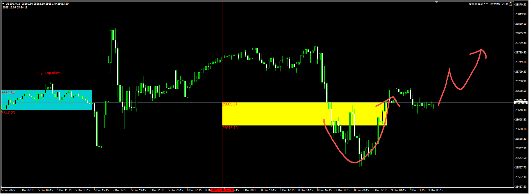Nasdaq: Yesterday, our plugin alert provided a yellow low-sweep liquidity operation suggestion, and the price movement basically conformed to our prediction. Currently, the price is near 25,650. We suggest long positions continue to hold. If the subsequent rebound recovers above 25,700, gradually advance protection. For detailed positions, please consult the plugin.