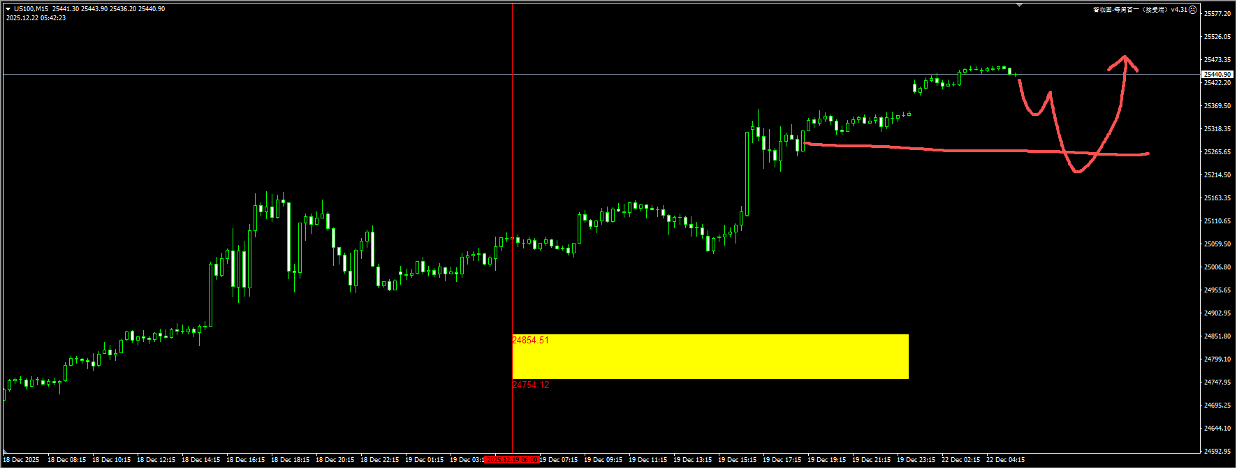 The Nasdaq rebounded and recaptured the 25,200/25,300 level as inflation data eased further and the Bank of Japan’s attitude remained relatively moderate after its rate hike. However, with the Christmas week approaching, trading volume may weaken. We will continue to wait for low liquidity before starting to capture the rebound signal. For detailed positions, please consult the plugin.