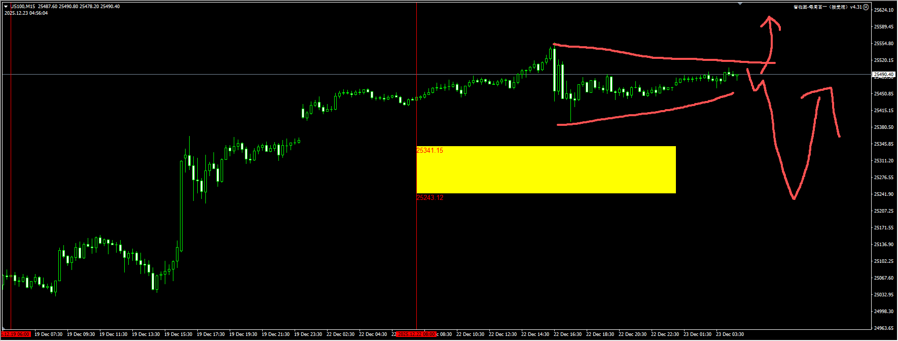 The Nasdaq rebounded and recaptured the 25,200/25,300 level as inflation data further eased and the Bank of Japan’s attitude remained relatively moderate after its interest rate hike. However, with the Christmas week approaching, trading volume may weaken. We will continue to wait for low liquidity before starting to capture the rebound signal. At the same time, we also reserve the opportunity for a direct breakthrough. For detailed positions, please consult the plugin.
