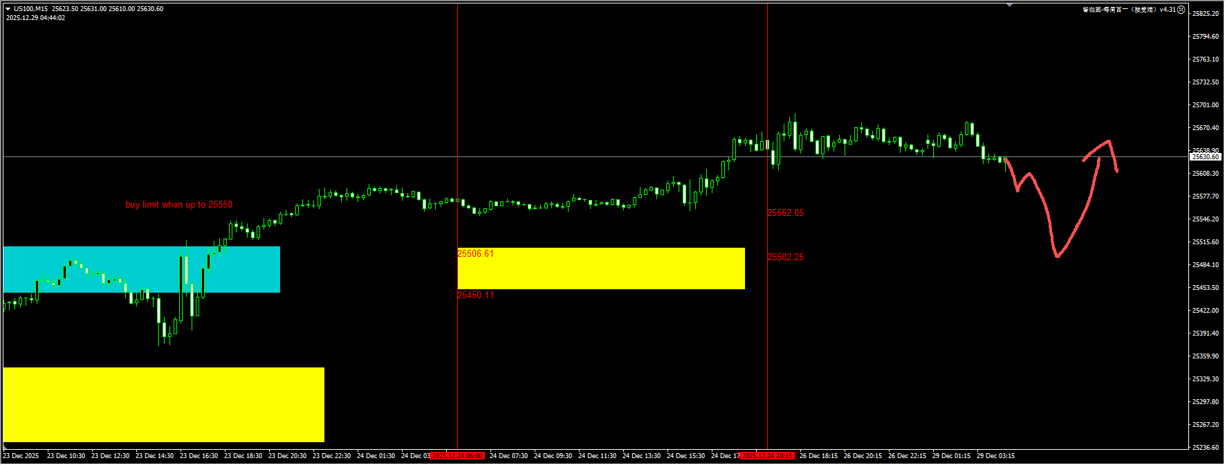 The Nasdaq index: The price remains between 25,600 and 25,700, but there may still be short-term fluctuations. Coupled with weakened trading during the holiday, we will continue to maintain liquidity sweeps around 25,500 before considering capturing long signals. For detailed positions, please consult the plugin.