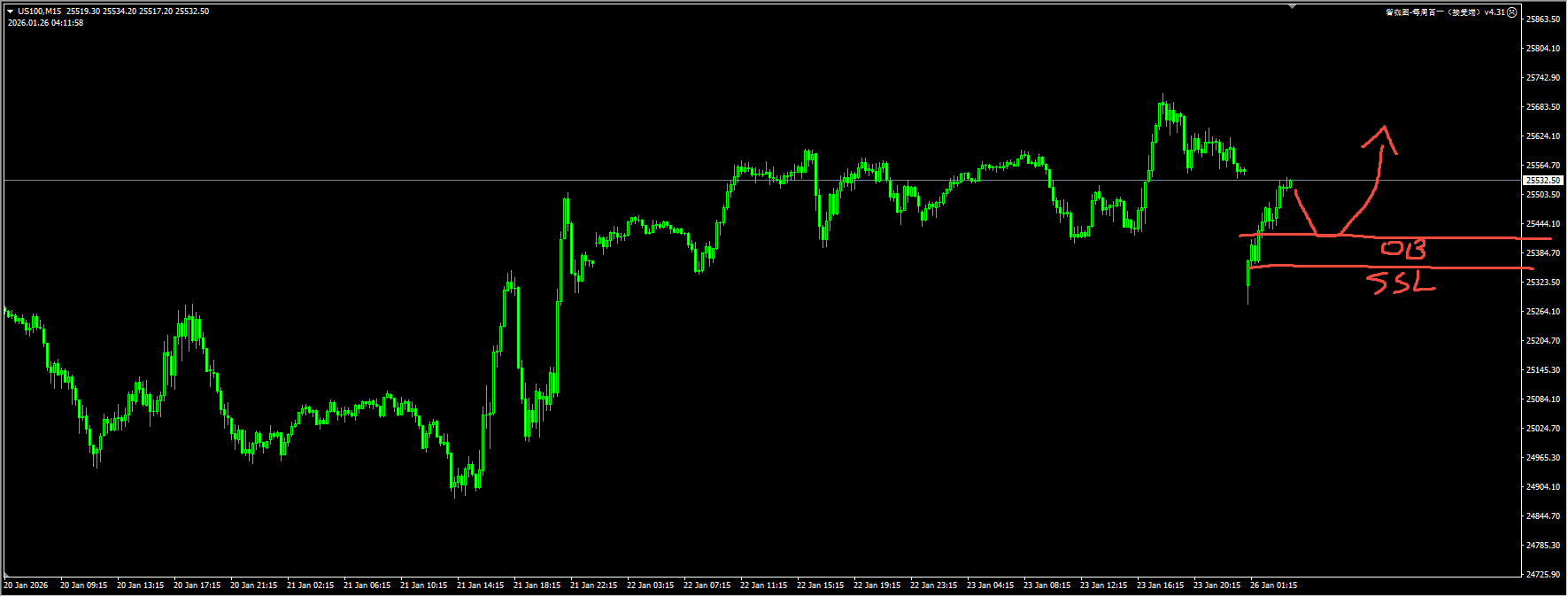 The Nasdaq: The price is consolidating expansively around 25,500. With the earnings reports of the 7 major US stocks coming out this week, it is expected that the price may still fluctuate within a range. Therefore, a more reasonable operation is to look for demand zones or sweep liquidity at the lower end of the current range, capture the long rebound signal, and then hold the advantageous position until the earnings reports are released. For detailed positions, please consult the plugin.