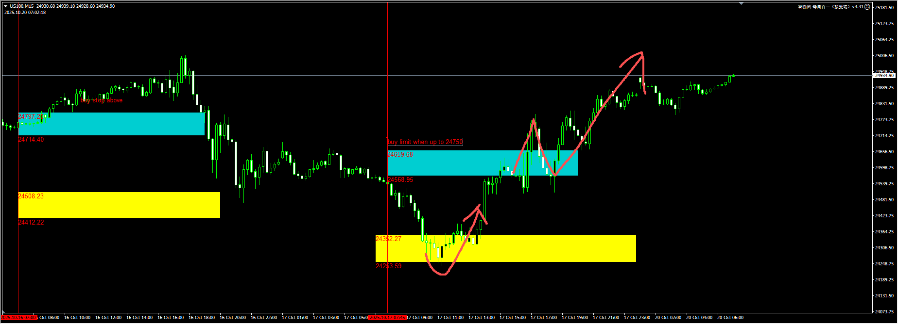 Nasdaq: The yellow low-sweep liquidity area we alerted last Friday through our plugin was highly effective. After the price dropped below 24,253, it rebounded significantly. Meanwhile, after the blue area broke through 24,750, there was a clear pullback confirmation followed by another rise. For today’s trading, we suggest that long positions be reduced and protective measures taken on Friday, and then held. For new positions, pay attention to the rebound signal after the intraday low-sweep at around 24,800/24,750. For detailed positions, please consult the plugin.