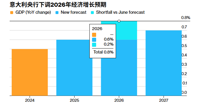 According to the latest forecast released by the Bank of Italy on Friday, the country’s gross domestic product (GDP) is expected to grow by only 0.6% next year, down from the previous forecast of 0.8%. The institution still predicts that this year’s GDP growth will be 0.6%, higher than the government’s latest forecast of 0.5%, and the GDP growth in 2027 will be 0.7%.