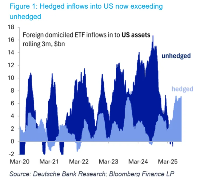 德意志银行对交易所交易基金(ETF)的分析显示,海外投资者在购买美国股票和债券时采取货币对冲措施,正在以“前所未有的速度”削减美元敞口。