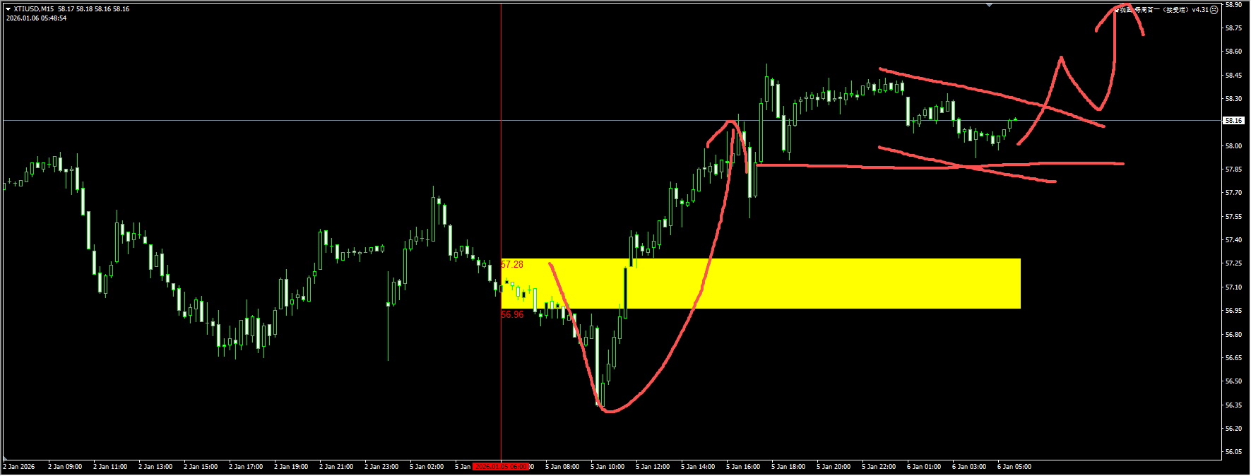 原油:昨天我们插件给到的是57下方清扫流动性,如图黄色区域。扫荡完成之后,出现v型反转,这种走势和我们的建议完美结合。日内关键需求区在58附近,如果守稳,我们建议等待突破回踩买入的信号。详细位置请咨询插件。