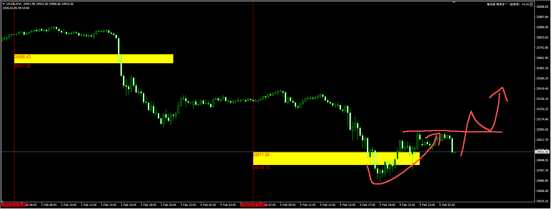 纳指:因AI叙事没有明显的开创性结果,反而侵蚀了软件公司业务,导致软件股大面积下跌。纳指隔夜如期下扫24900下方的流动性,目前价格暂时反弹。但日内建议想要继续抓反弹信号,需要等待25050-25100区域收复之后,等待回踩确认才买入。详细位置请咨询插件。