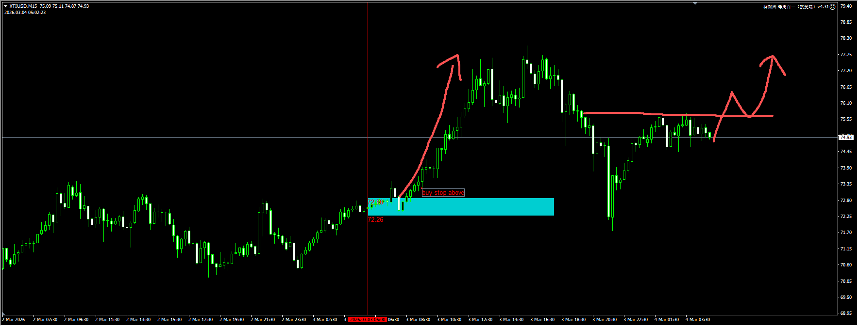 原油:昨天我们插件提示的蓝色区域只要突破就进行buy stop的操作,实际能够实现大约9倍以上的盈亏比。目前价格在75-76区域收敛整理,期待看到重新向上突破的格局,收复76以后,再考虑新的多头信号。详细位置请咨询插件。
