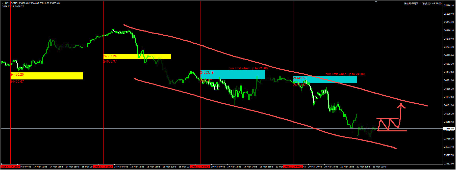 纳指:价格继续保持下行通道的走势,早盘跳空低开之后,目前暂时在23850附近整理。因战事的不可控制因素,暂时建议观望,或者等待技术形态有明确企稳信号,再抓短多反弹。详细位置请咨询插件。