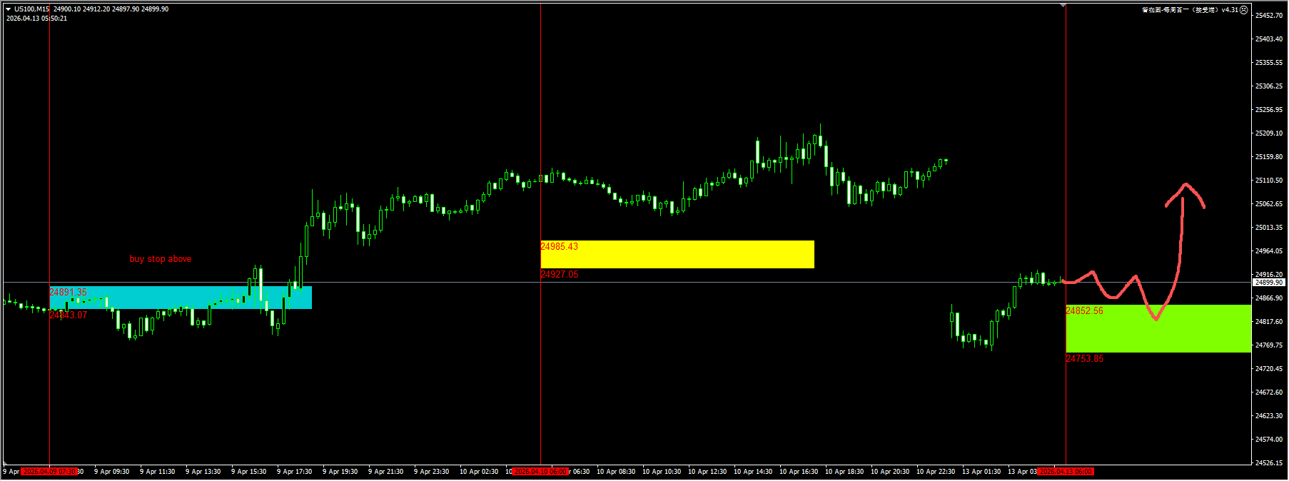纳指:价格开盘之后有400点左右的跳空缺口,日内优先关注回补机会。目前早盘关键需求区在24850附近,可以尝试1次buy limit。详细位置请咨询插件。