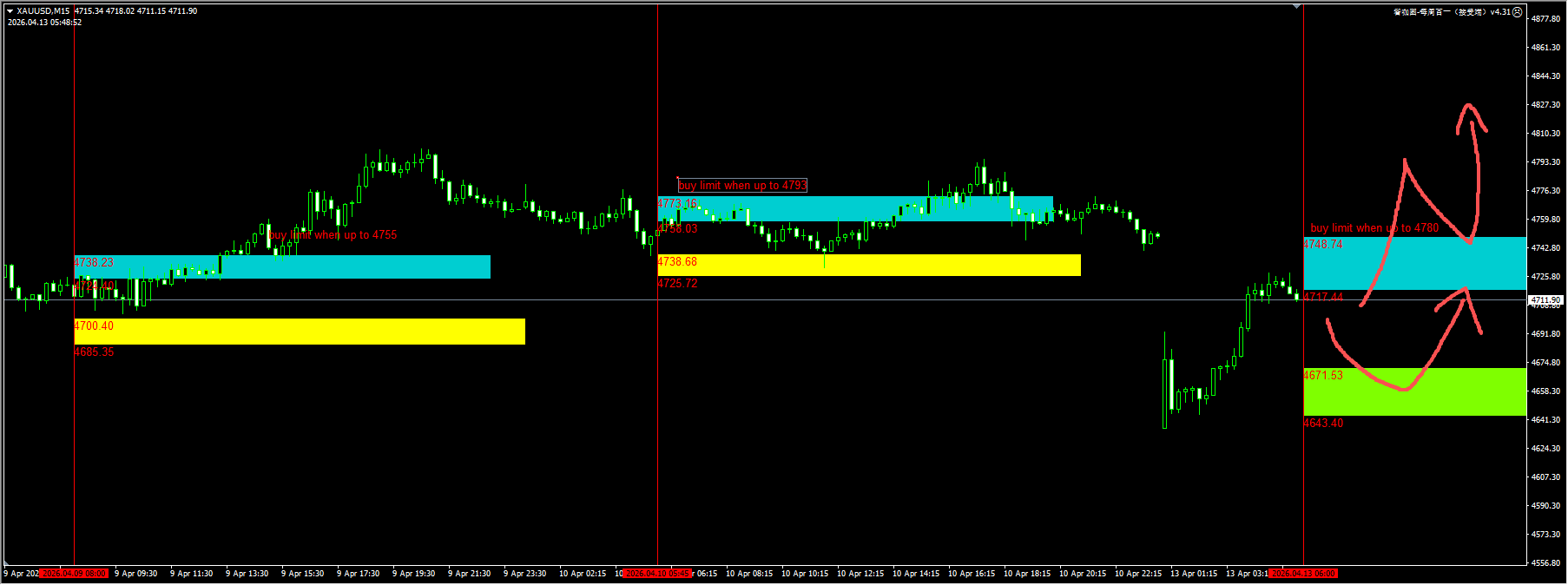 黄金:日内预计价格将会继续回补开盘的跳空缺口。我们关注回踩绿色区域的buy limit机会;同时,如果缺口被弥补,进而关注4750/4780能否站稳,再继续尝试买入。详细位置请咨询插件。